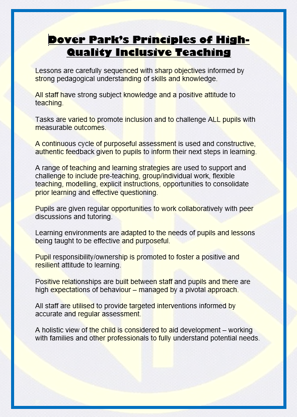 At Dover Park Primary School we follow an adaptive teaching model, where we adapt the learning in each lesson to meet the needs of all children. We fully comply with out equalities, as outlined in the Equality Act 2010 and the Special Educational Needs and Disabilities Regulations 2014 by making the curriculum accessible for all pupils, including those with special educational needs and disabilities.