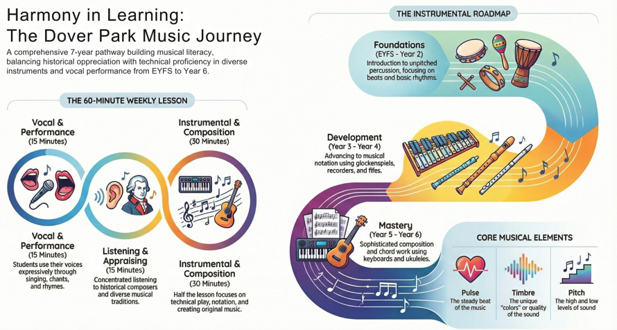 Music teaching at Dover Park Primary School aims to follow the requirements of the National Curriculum; providing a broad, balanced and differentiated curriculum and ensuring the progressive development of musical concepts, knowledge and skills.  At Dover Park we recognise that music plays an important part in helping children to feel part of a community, and so we provide opportunities for all children to create, play, perform and enjoy music both in class and to an audience. Through assemblies, concerts and key stage performances children are able to express their emotions and showcase their understanding of how to perform with awareness of others. Lessons enable children to develop their skills, appreciate a wide variety of musical forms, and begin to make judgements about the quality of music.